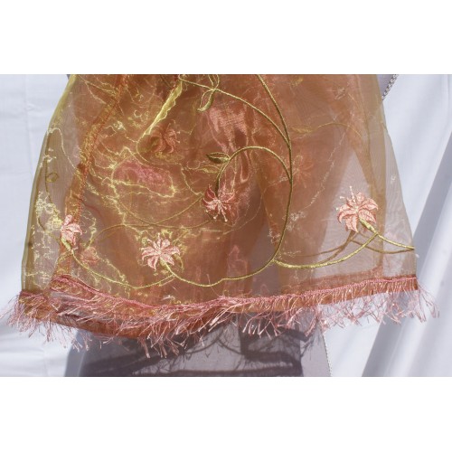 Sur fond mordoré, de belles branches parées de jolies fleurs saumon donnent à cette écharpe un charme un peu désuet. De petites franges de laine saumon à poils brillants complètent cette impression. En voile très léger pour les soirées fraîches d'été.